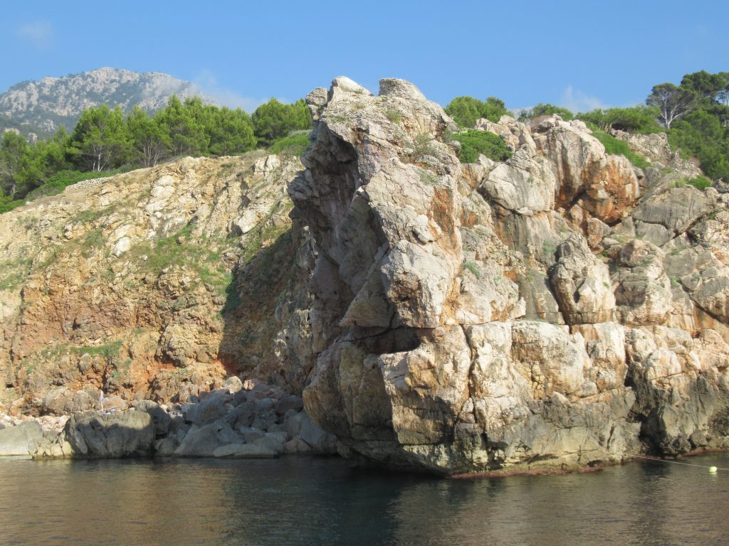 High cliffs line the coast along the south west corner of Mallorca and as we passed between it and Isla Dragonera, the scenery became more and more magnificent – the craggy, granite grey mountain tops of the Serra de Tramuntana, jutting up above green slopes that fall steeply away to the sea. It was a welcome distraction from the noise and heat of the engine on a hot and wind free day.