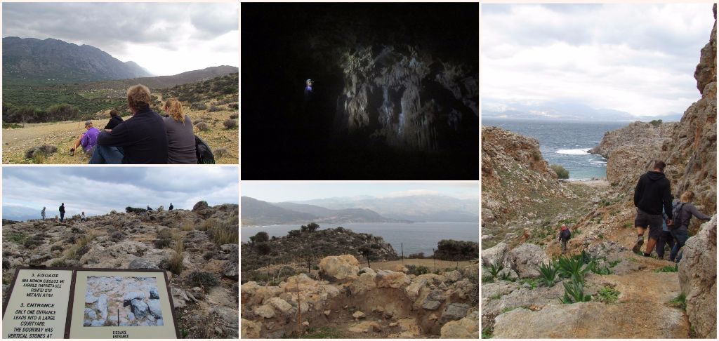 It was a cold and blustery day for the Bat Cave Walk. Starting in Kavoussi we walked through olive groves towards the sea and down a small gorge to Agriomandra beach. Then it was up over rough scrub to the remains of an ancient settlement. Along the way we scrambled down the hillside to the entrance to the Bat Cave. On hands and knees we crawled through the entrance and into the large cavern behind. No bats to be seen unfortunately but it was oddly warm inside the cave, so much so that it kept fogging up my camera.