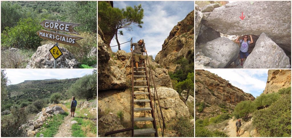Our first explore into the countryside was to the nearby town of Kritsa. We took the bus, a 20 minute ride through olive groves, rising gently upwards to Kritsa where whitewashed houses hugged the steep sided hill and tourist shops crowded the streets but at this time of year we were the only visitors. Just outside the village the gorge begins and what a magnificent one it is too. After recently walking the Samaria gorge we wondered how Kritsa would compare but it more than held it’s own. Narrow and rocky with some small boulder climbs to negotiate with the help of iron steps hammered into the rock, it was an adventurous walk. It’s only a couple of miles long and all too soon it widened out and we reached the exit point to walk back to Ag. Nik. Dirt tracks then a road brought us to the ruins of the Minoan city of Lato; we decided to leave a visit for another day, which turned out to be a mistake as we never got around to going back. A stony Minoan track then wound us down the hillside, all brown and dusty at this time of year. We passed through a small holding then back onto a road to take us back to town.
