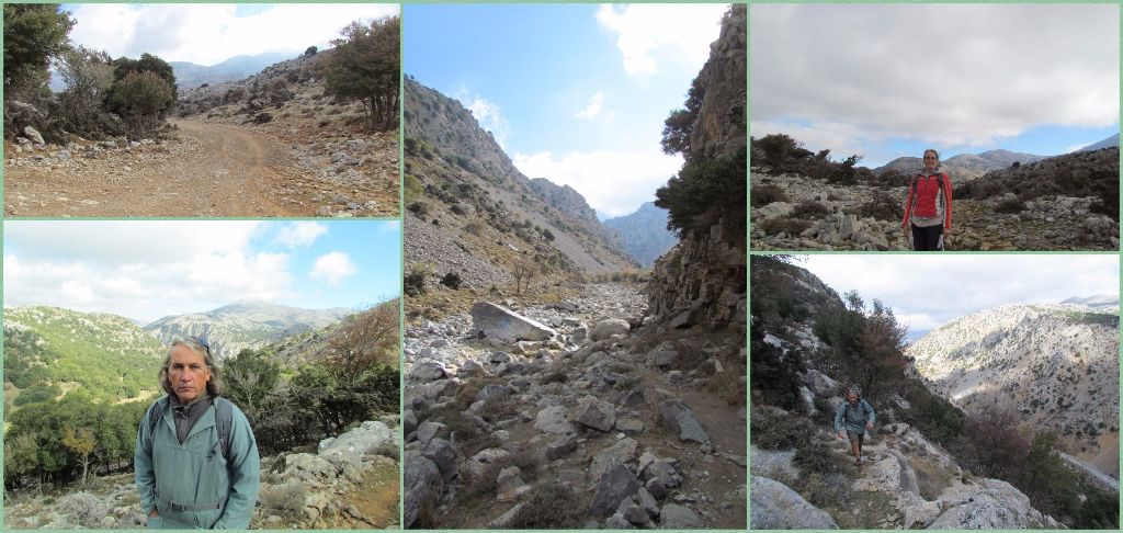 A track led us over rocky ground and up over a saddle for a fine view of the Lasithi plateau below us. A Minoan track zigzagged down the steep hillside. It started off ok for walking but then someone had decided to bulldoze the track and spread it with small stones which were a nightmare for walking on, our feet regularly rolling with the stones and both of us ending on our bums at one point. Glad to be at the bottom we walked along the flat track behind a reservoir before turning onto the Havgas Gorge. It was completely dry at this time of year but looking at some of the boulders that lay scattered around there must be some water coming down here when the snows melt.