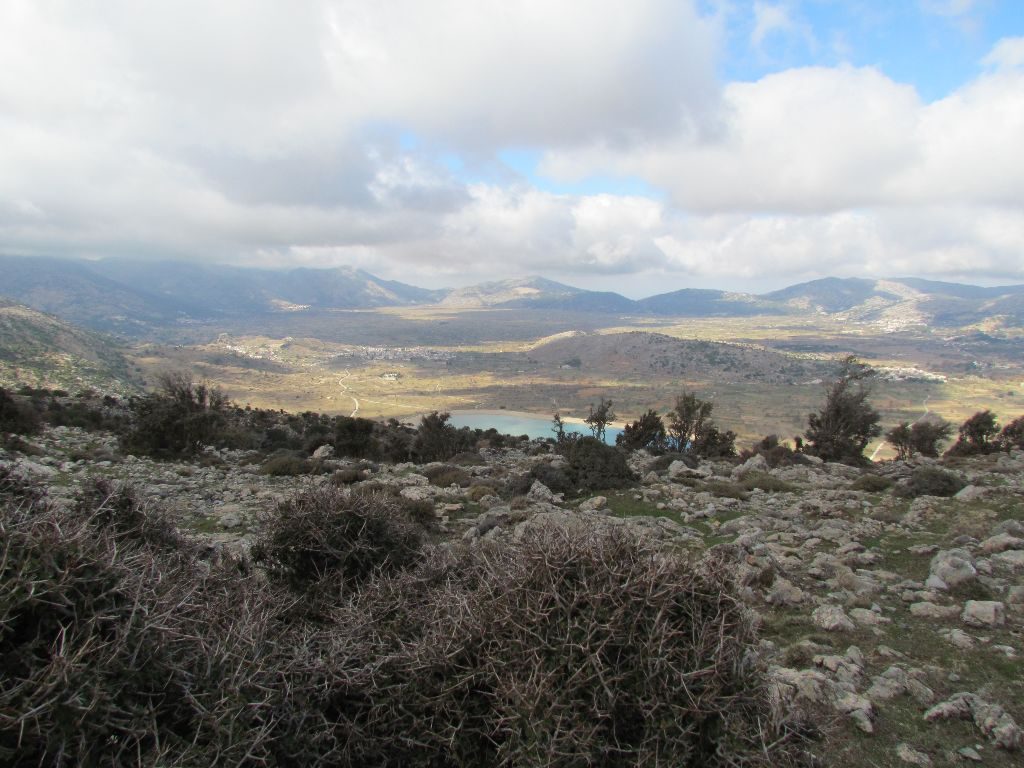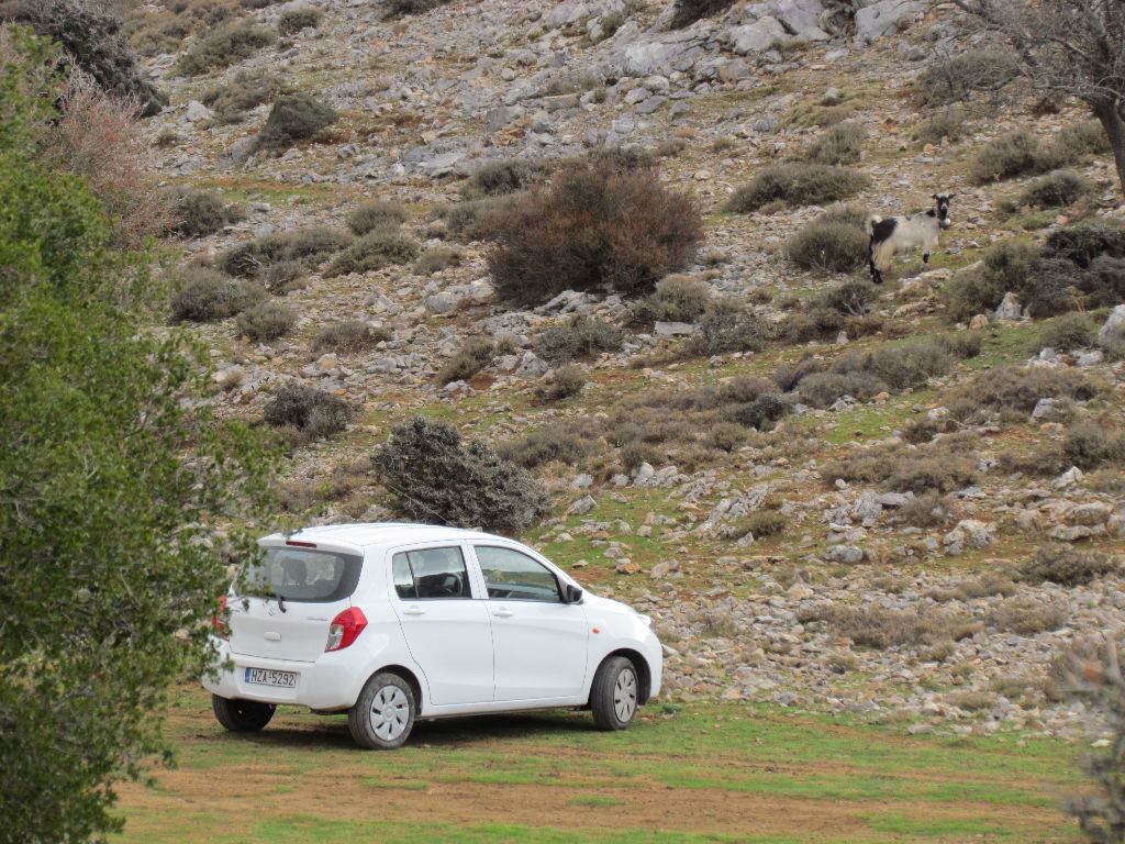 We were able to pick our way over the stony river bed, following the painted arrows and dots, criss-crossing back and forth. We could have continued up the river but the route we were following bore away steeply up a hill. It was a bit of a slog, especially the first part where we gained the most height. We crested a rise and there was Suzy with a goat for company. Driving back down was far quicker than the journey up to the plateau and we were able to enjoy the stunning view across Mirabello Bay.