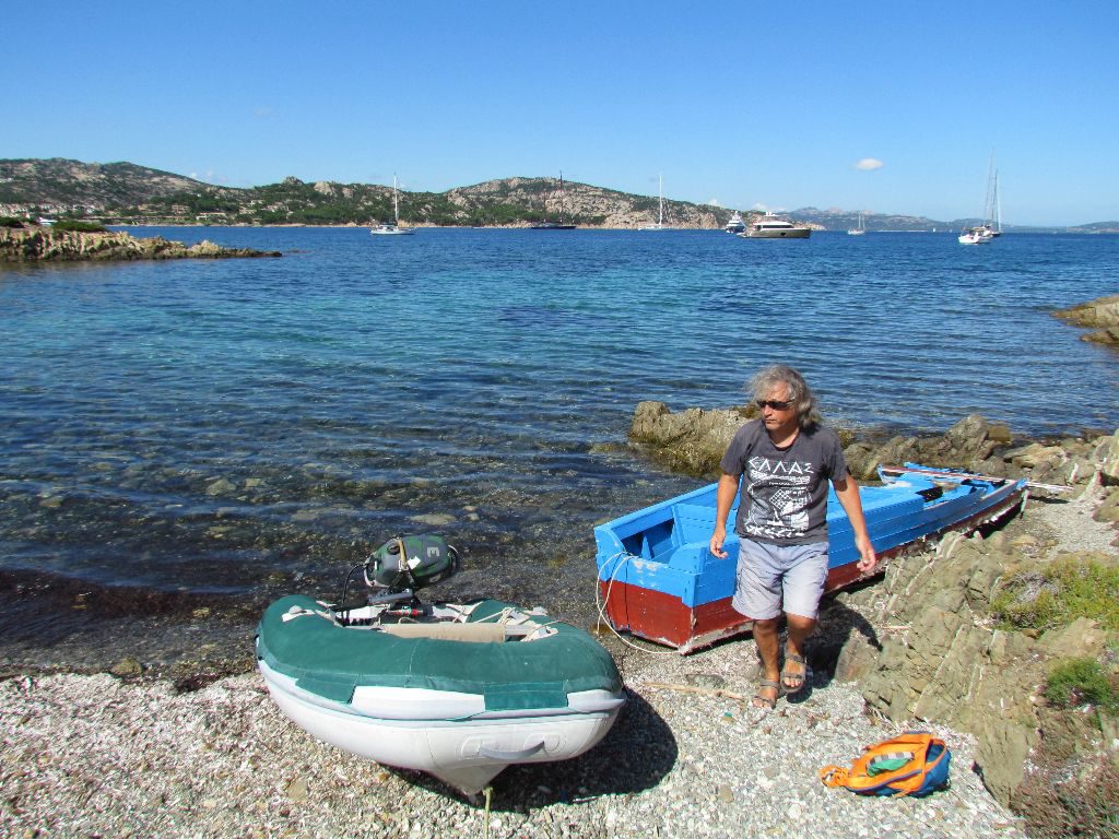 The next day the wind went west and blew strong. More superyachts arrived. Another day passed being annoyed by their tenders. The following morning the wind switched back north and stayed strong, gusting up to F6. The mooring company was out laying even more concrete blocks that encroached on where we were anchored. We were politely asked to move as they wanted to make a new mooring right where our anchor was. We pondered going further into the cala but decided to check out anchoring opposite where we were, off the beach off Capriccioli instead. What a result, the mooring company had done us a favour! Better shelter, no RIBs annoying us and a much more comfortable place to swim without worrying about being chopped into bits by a passing propeller. We did look up the fees for staying on a mooring and could see why they wanted to put even more out.