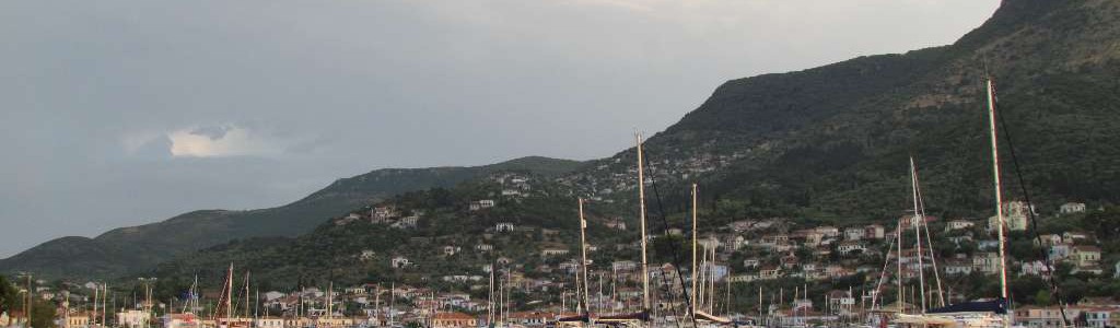 As we settled down with a relaxing vino another storm rumbled to the south. Then the wind picked up and the vino was cancelled. Soon after it seemed most of the boats in the southern Ionian decided to come in to Vathi. The wind was now blowing from the south; when we arrived it was north westerly so we’d set to that direction and reversed into the shallower water along the shore. Now we’d swung away from the shore and boats were anchoring in front of us, if the wind went back north they’d be in very shallow water. All around us boats were racing each other for space, coming in from different directions at full pelt to drop the anchor and keep on going over the top of it. In the gusting wind boats were swinging around at every angle, sailing around the chain and making it difficult to judge where anchors lay. We have never been in a situation like that where so many boats arrived en masse. Plenty of shouting went on and for the first time in a long time we deployed fenders in an anchorage. In the space of half an hour over 100 boats came into Vathi port. All evening and into the night superyachts, small yachts and powerboats crewed by charterers and owners; they all arrived in a steady stream to Vathi, some came in wearing full oilies so the weather must have been very exciting out there.