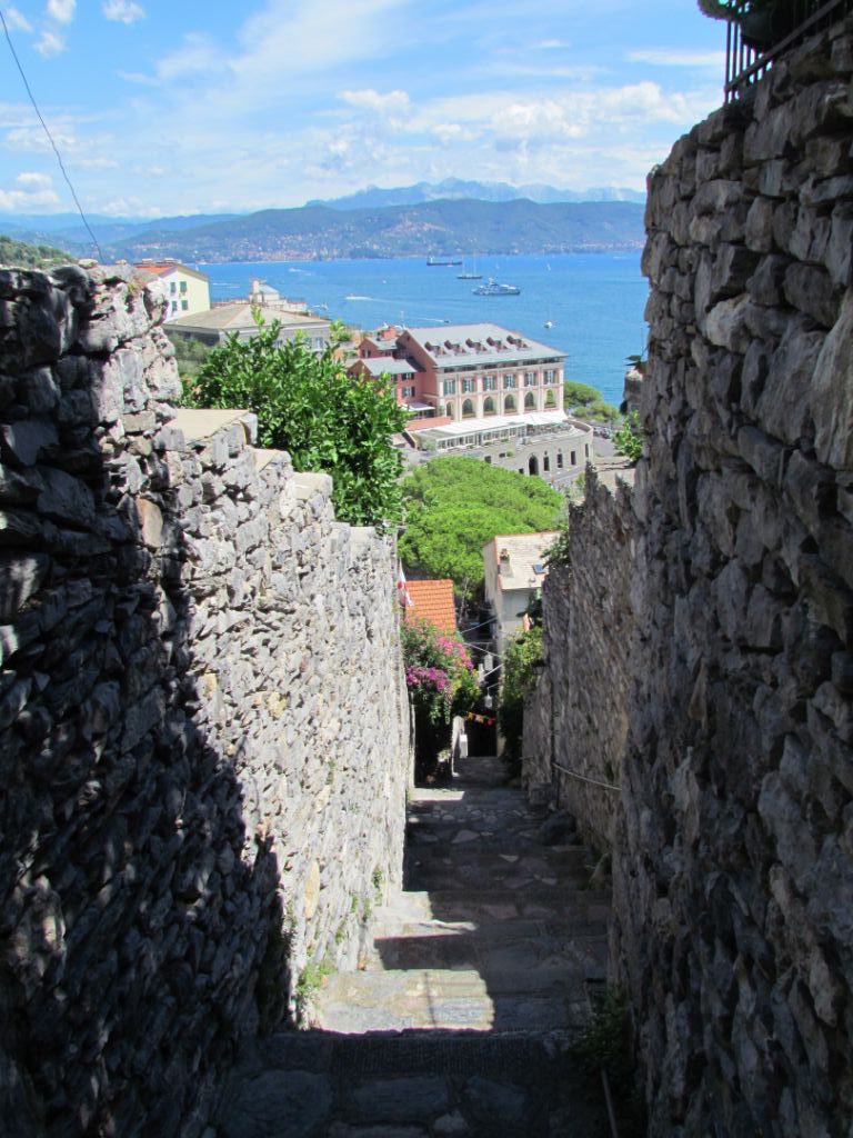 By Wednesday the skies were bright and we walked up over the ridge and down into Portovenere. The walk up a mule track was pleasant, the walk down the other side not so much. There isn’t a footpath, just a white line drawn on the edge of the road to demarcate the pedestrian area. We had to be on constant alert for cars wandering over the line as several got far too close for comfort. It was a relief to be down into the pretty waterside town.