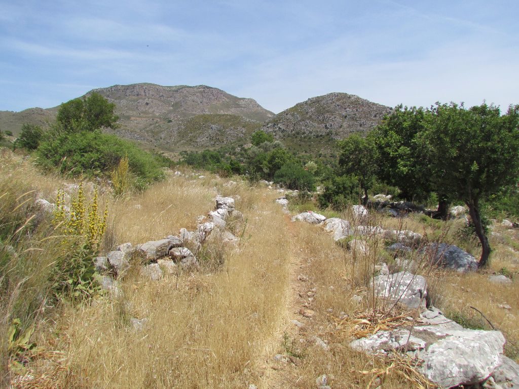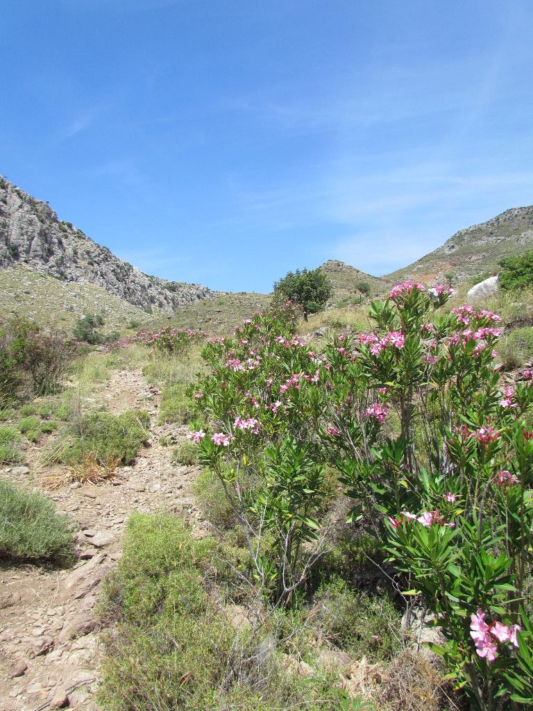 Tuesday was my birthday which kicked off with another cooked breakfast, this time a Colin cooked Ulster fry complete with potato bread which we’d found in the Corner Shop in Ag. Nik. A few hours of resting was needed to let that settle before going out to walk the Carian trail heading north. We were soon out in the countryside, being greeted with waves and merhabas by the people we passed. Life seemed quite rural with sheep and chickens wandering freely around and allotments growing veg. The trail headed up and became a rocky track, following a dry river bed in places with pink oleander growing in bright clumps along the rivers course.