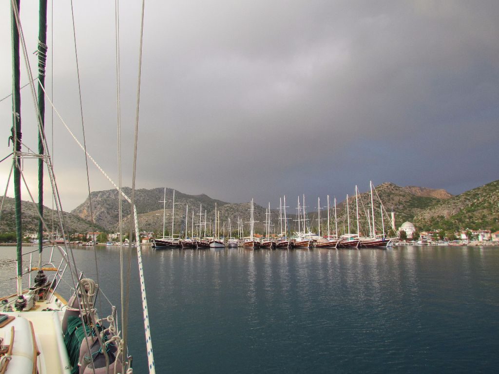 It was a flat calm morning as we set off for Turkey and it stayed that way all the way across. We saw only one other ship leaving us wondering where everyone else was. As we approached Bozburun the silver domed roof of the mosque was unmistakable. As were all the huge gullets laid up along the walls and quays, so many of them, hopefully they all disperse across a wide area when they leave their winter quarters.