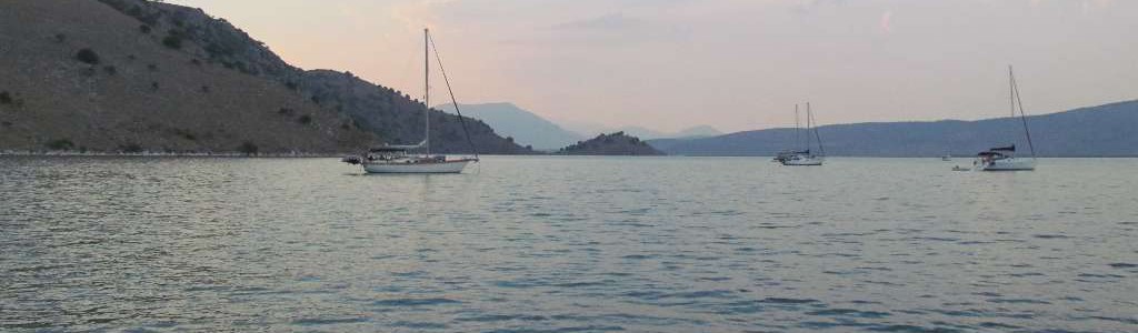 Our plan was to do a clockwise circuit of the Ionian, running down the mainland, across to the Peloponnese and back up the islands. After Mitika our next stop was Petalas on the mainland, our longest journey for a while at 20nm. Once we were south of Kalamos a F6 blew up off the land hiting us at about 30 degrees and making life uncomfortable for a while. It only lasted half an hour and we were back to no wind. Eventually it built enough for us to sail and we managed a whole 7nm, the furthest we’ve sailed in Greece! There are lots of small, uninhabited islands to look at on the way and shearwaters skimmed and bobbed around us. A lot of fish farms too, but all close to shore so not a hazard.
