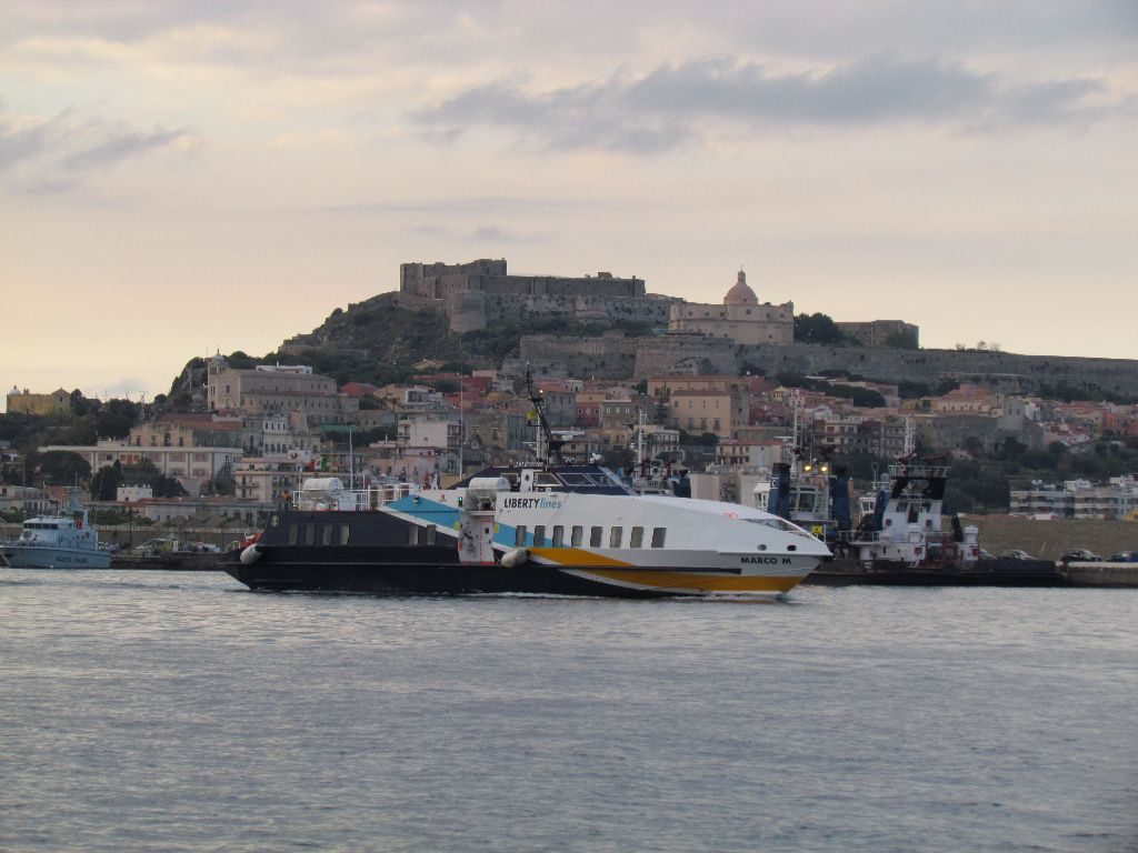 At Milazzo the anchorage north of the harbour wall already had two boats there and as we arrived the wash from three ferries had created a rollercoaster swell. We nosed our way in to the beach but couldn’t find a depth we liked in the steeply shelving seabed. Instead we went to the anchorage at the harbour entrance and found a spot in 4m off the small boat mooring buoys. The ship wash wasn’t so bad as the ferries have to slow down to enter and leave and what little wind there was had us pointing bows into the roll. The view was ‘industrial’ to the east, or very Blade Runner as Colin described it when night fell and thousands of lights lit up the chimneys and gantries. To the NW we had a view of the harbour and the town rising up to it’s castle.