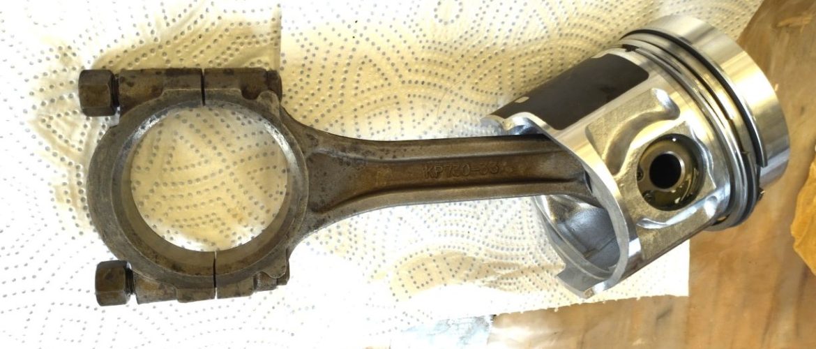 The overhaul kit for our engine type included four new pistons. They came constructed but we needed to take the gudgeon pin out in order to attach each piston to its conrod. This involved removing, then refitting, a very fiddly circlip. Circlips are the little feckers of the engineering world. They always give us the worry that they’re going to ping off and never be found again. After a bit of a struggle with the first one, thankfully the work on the others went smoothly. We again used liberal amounts of assembly lube on the piston bearings to prevent them seizing up before use.