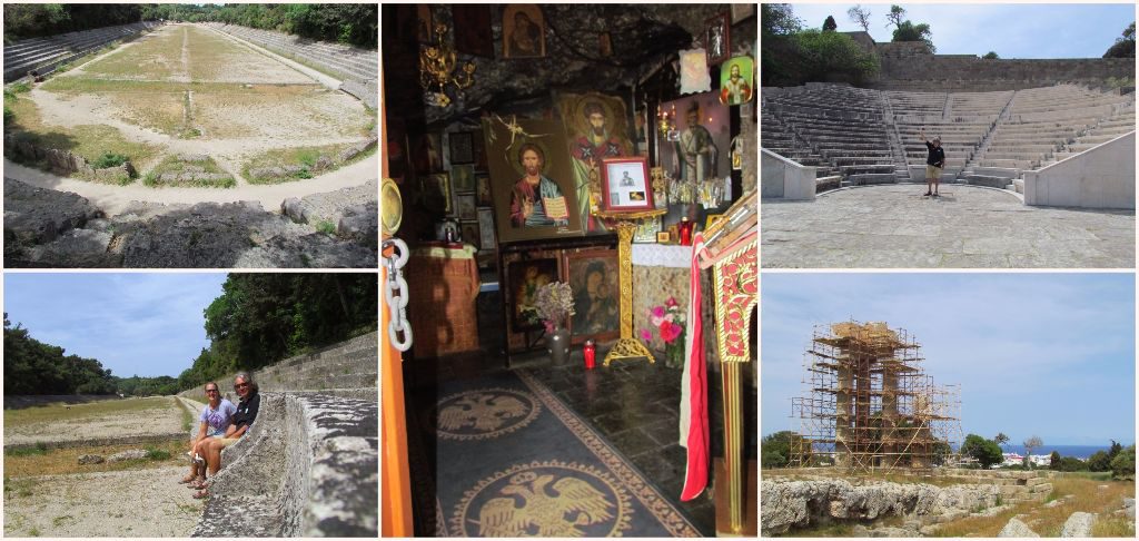 On the edge of town is some leafy parkland containing the remains of an old sports stadium and the acropolis of Rhodes, currently being held up with scaffolding. We kept on going up the hill of Monte Smith for far reaching views out to sea. The weather had been hazy for the last few days but that day the sky had cleared and we could see Turkey and our next destination of Symi.