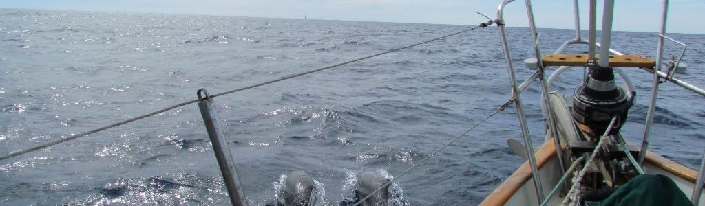 We went for a slightly more north course to keep the wind at a better angle for us to sail, nudging west as the wind varied. Dolphins came to visit us on and off, one group playing for over an hour around Emerald’s bow, leaping out of the water and looking like they were having a grand old time. After last season’s dolphin drought, it was wonderful to have them back. There’s something incredibly special about looking down from the bow and making eye to eye contact with a dolphin looking back at you.