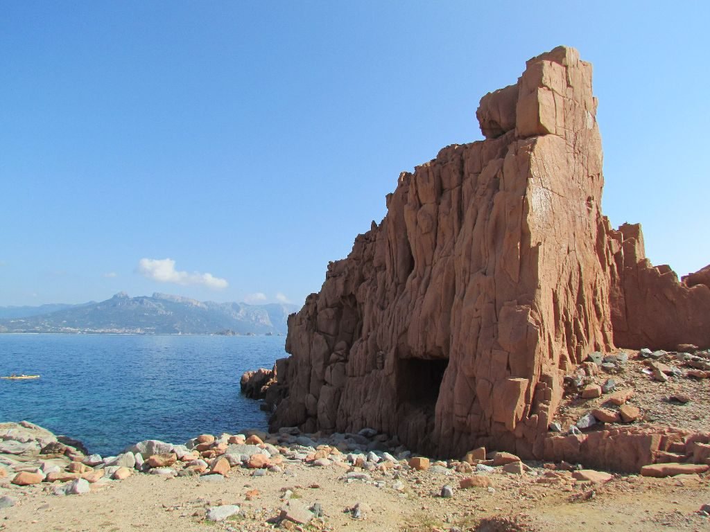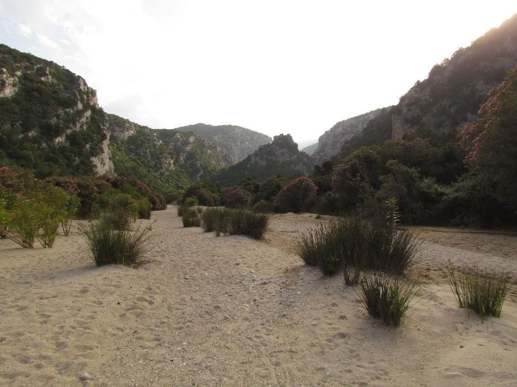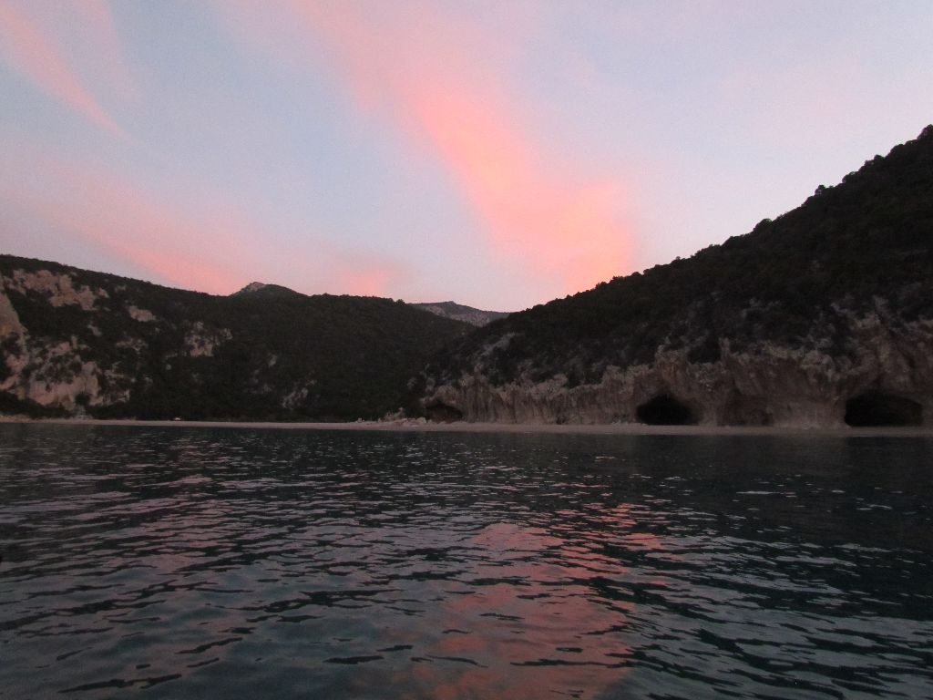As we left the caves to return to Emerald, so of course did all the other boats, both fast RIBs and the bigger trip boats, and we had a bouncy old time in the washing machine chop. We could see Emerald rearing and rolling at anchor as the boats passed by to disgorge their guests onto the pontoon at Cala Luna. The boats then went and bobbed at sea for an hour or so so others could use the pontoon. In dribs and drabs the RIBs began to leave and soon all the trip boats had gone too. By 6pm it was a much more calmer place and I went ashore for a wander. Behind the beach is a small a lake fringed by pink oleander and behind it lay a scenic canyon with high mountains rising in the background; it was a beautiful sight. Opposite where we were anchored were several caves which were begging to be investigated despite a sign saying no entry due to risk of rock falls. Many people during the day had ignored the signs too!