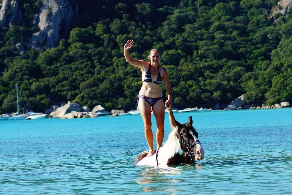 At the beach we took off saddles, stripped down to our swim wear and mounted up again, now bareback. A gentle nudge and Jason was walking into the sea and soon we were deep enough for my feet to brush the cool water. The leader then took each horse in turn into deeper water. There we had the chance to stand on their back and then dive into the sea. Mounted again, we then went off for a swim. I think Jason preferred just watching to swimming. But it was a really special moment for me even just standing in the clear water, feet swishing, me and horse.