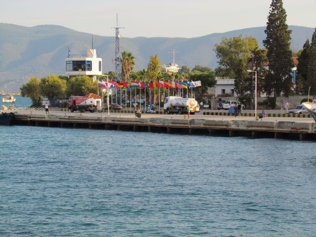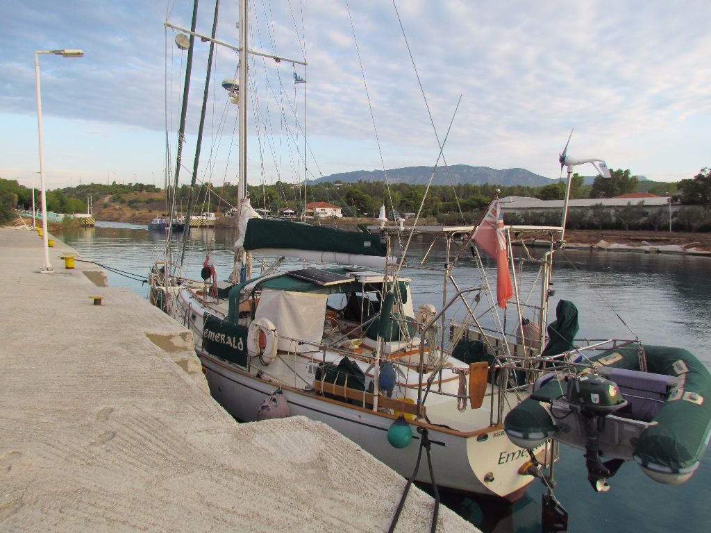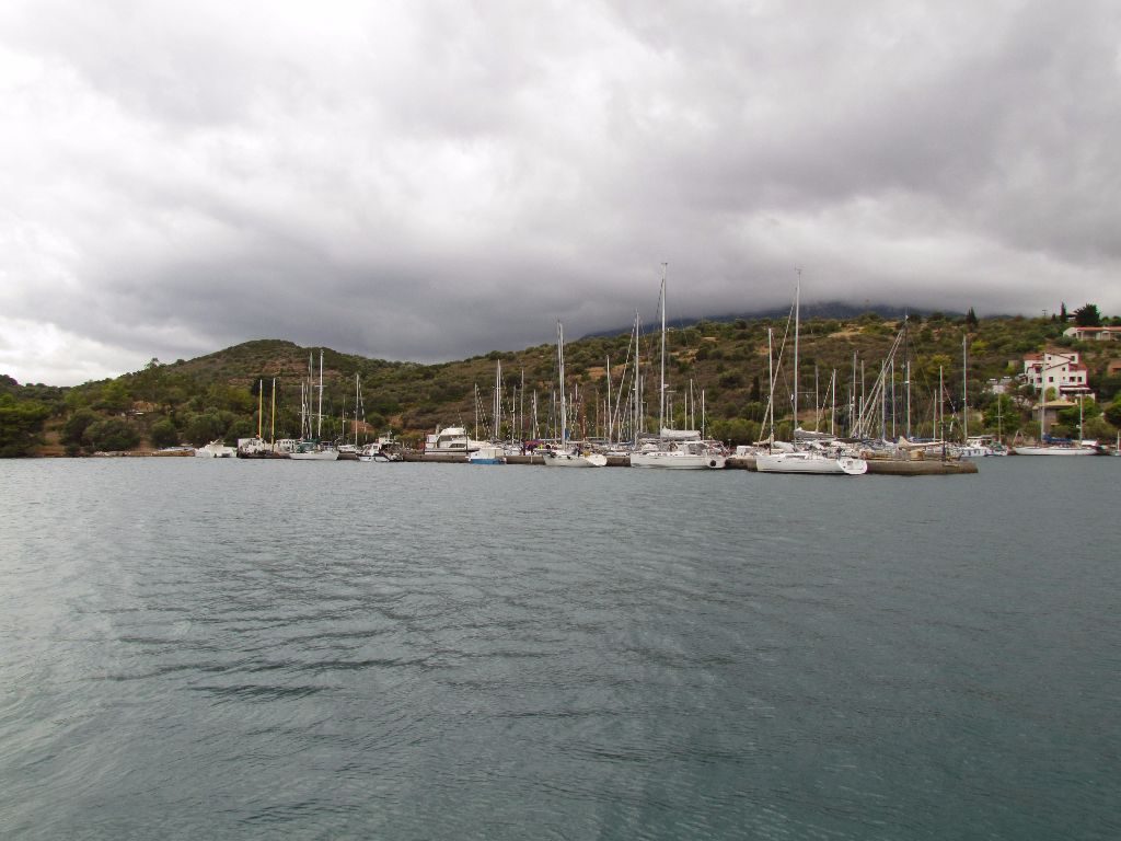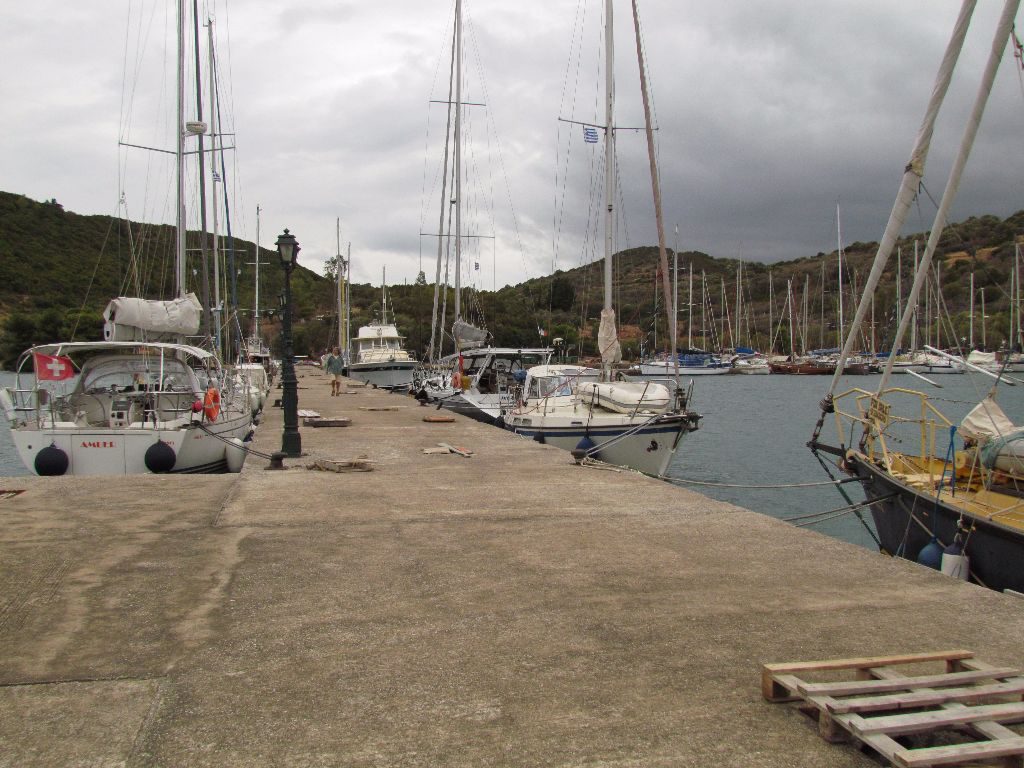 Friends arrived that evening so we had a good catch up with them before leaving for Trizonia under gloomy skies the next morning. Winds were light but picked up in the gulf and by the time we arrived at the island we had a F6 to 7 chasing us in. Trizonia has an unfinished marina, colonised by liveaboards and abandoned boats. We hoped for a spot on the inside breakwater but nothing looked big enough so had to plump for a spot on the outside. With wind blowing us on it was a quick berthing manoeuvre.