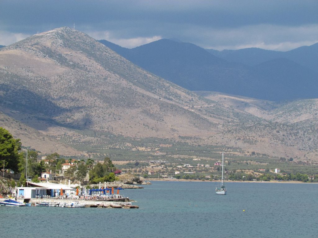 Galaxidi is a cute little town but in late September it was quiet, even with 10 or so yachts stern to on the quay. We had a wander around in the sunshine and scoped out the bus for a trip to Delphi. That evening, clouds rolled in and thunder rumbled in the distance but stayed clear of us with just a dirty deck to show from a short rain shower.