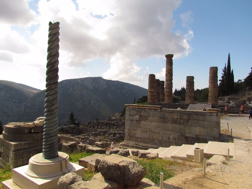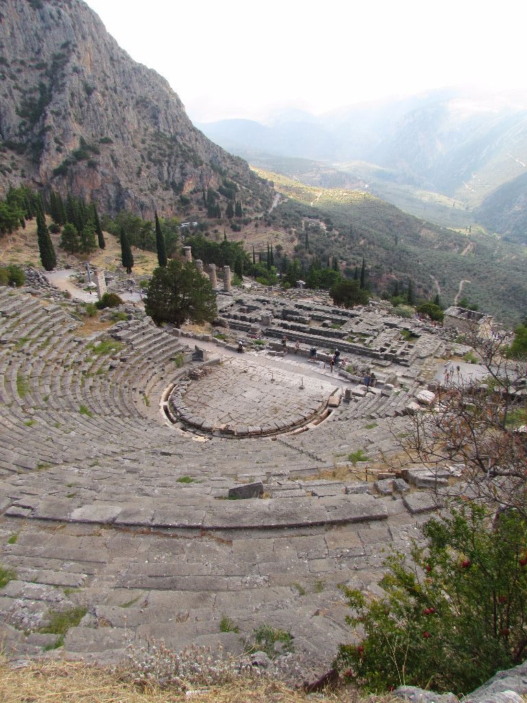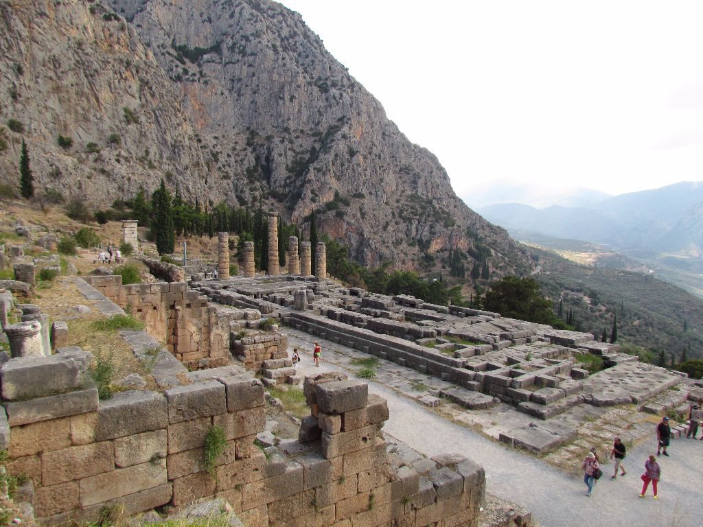 Delphi was one of the most atmospheric places we have visited so far. Perched up on a rocky eyrie on the slopes of Mount Parnassus, with clouds swirling around above gave it an added ambience. There were the expected tourist crowds but it wasn’t over-crowded and we were able to move around with ease. Walking up the ceremonial pathway we tried to imagine being there for some wisdom from the Delphic Oracle – we asked if we would get some decent winds to blow us to Italy but we couldn’t hear any reply.