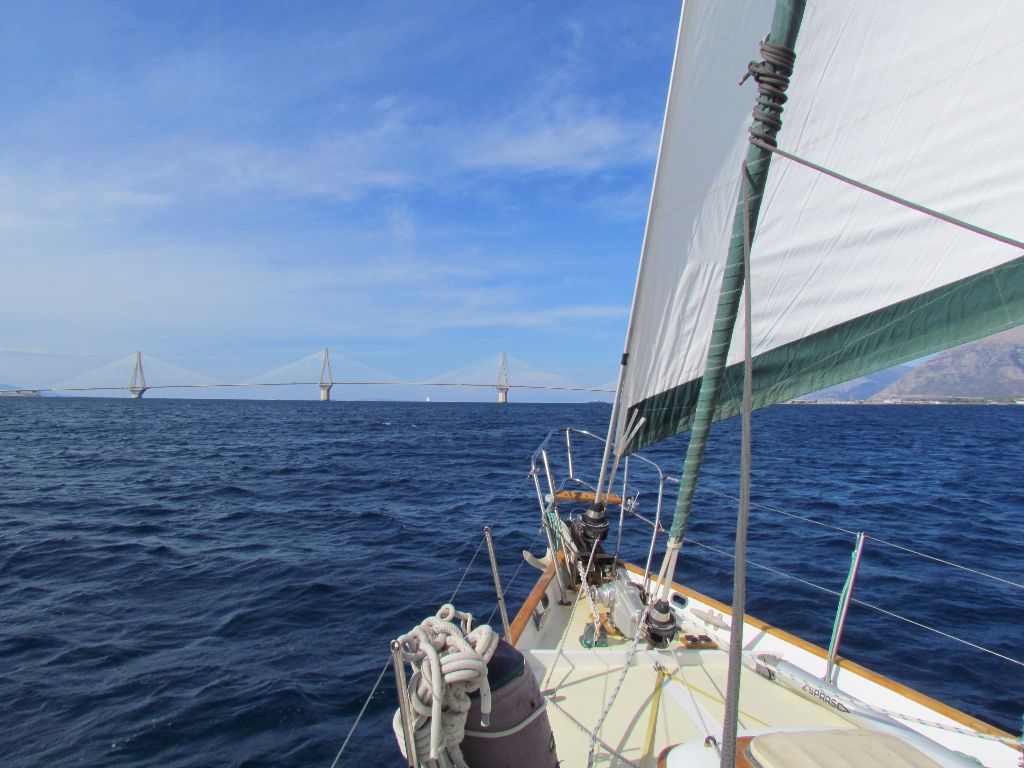 The wind seemed to be lighter the next morning so we headed on. Once out from the top of the island the wind arrived and blasted us on towards the Rion bridge. The bridge controllers request that you call up from 5nm for directions on which span to use. We possibly have a problem with our radio as we couldn’t get the bridge controllers to hear us until we were nearly 3nm away; we asked a passing boat (the Contest from the other day) to relay a message for us and kept trying ourselves. We were directed to use the middle span with 45m clearance; more than enough for our 20m mast, but it still looks awfully close going under. We whizzed through at 7kts with a scrap of genny flying. Weeeeeeeee!