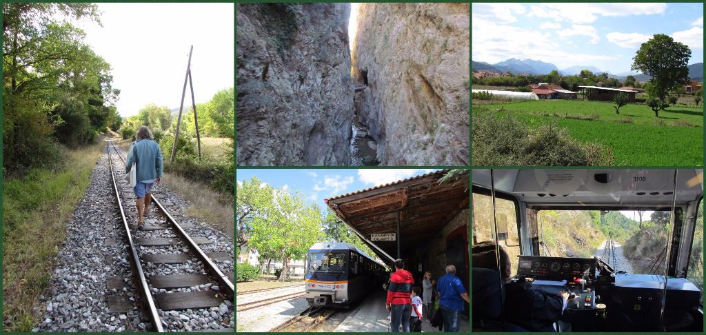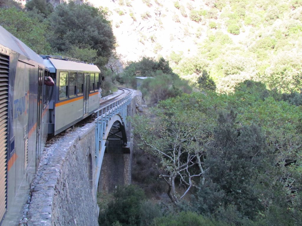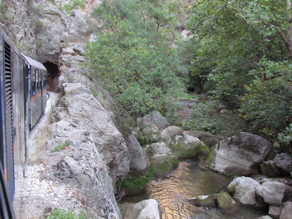 The clouds of the previous few days had disappeared leaving a beautiful clear blue sky in their wake. We squeezed into our seats – the train is quite narrow – and soon after leaving the station at Diakofto we were in the gorge and heading upwards. Where the track is steep, the train uses a rack system to provide extra traction. The gorge was stunning and we travelled through tunnels, rock cut outs and over narrow bridges with a river tumbling over rocks beside the track.