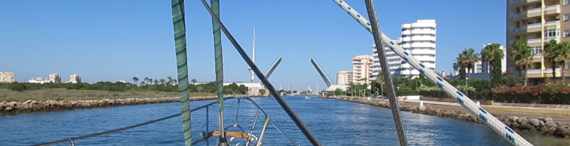 Back in the present, we were surfing our way around Cabo de Palos, chased by a F7 wind. We had time in hand and arrived twenty minutes early at the approach to the bridge. There we struggled to hold station in the strong wind which was trying to blow us towards it. With the wind and narrow, shallow channel, we were reluctant to move closer until the 13:55 radio call came, confirming that the bridge would be opening. It came, so we began to move down the channel, Colin on the helm, me on the foredeck keeping an eye on the bridge. We were getting close to the reported shallow area at the corner, it was now 14:03, with cars still crossing, and no sign of it opening. We heard an announcement in Spanish, but we didn’t understand it. It looked like the bridge wasn’t going to open!