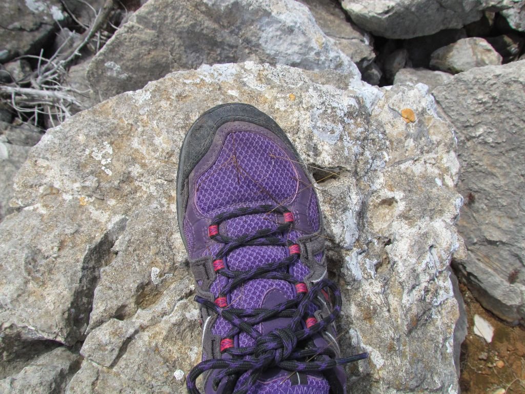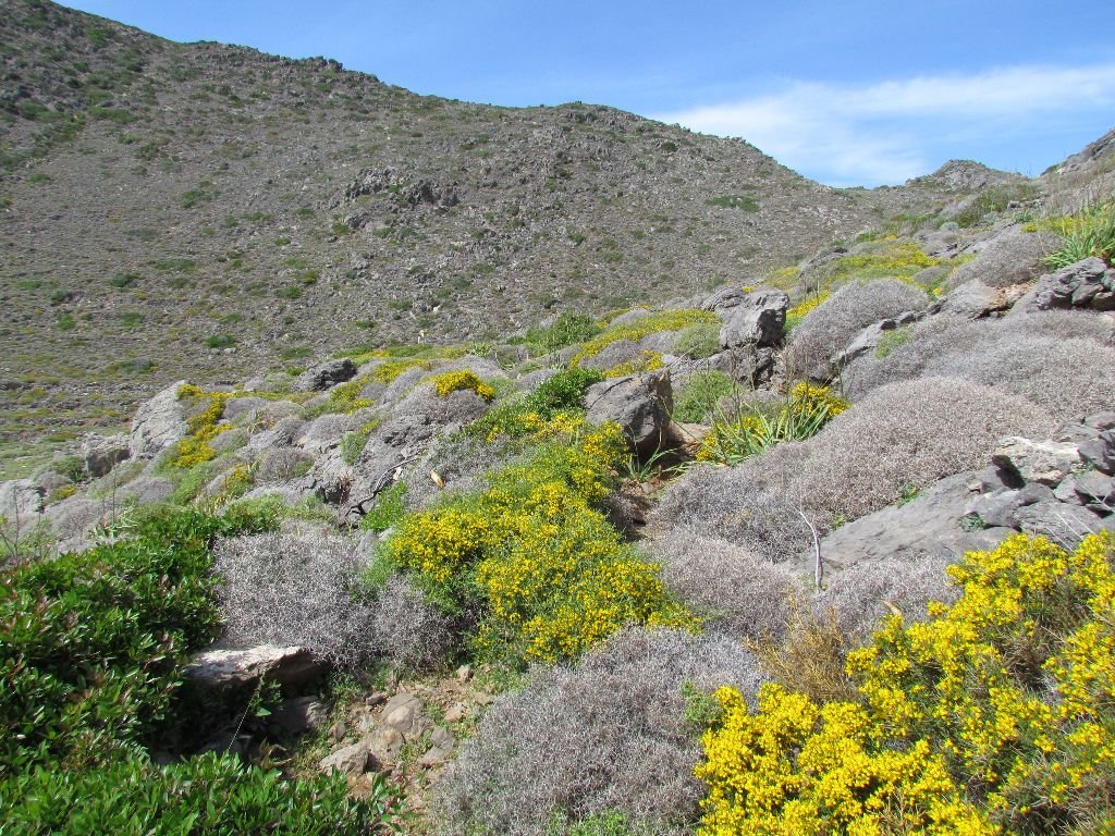 Argh – I soon discovered that open sandals were a bad shoe choice! Within a few meters of following the path to Agios Ekaterina my feet had been attacked several times by the evil spiky bushes that were growing everywhere. The ground was stony and the red dots marking the route had disappeared so after being spiked so many times that plugging onwards was no longer fun, I turned around in hope of a better track around the other side.