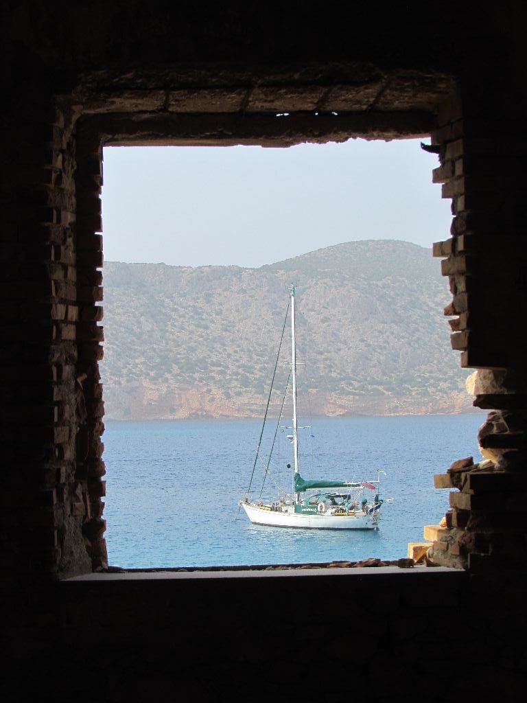 Heading down to the head of the bay, the inlet reminded me of a Scottish loch. Is there an equivalent to a loch in Greek? A cluster of ruins and newer houses curved around the head and we found good holding in 7.5m.