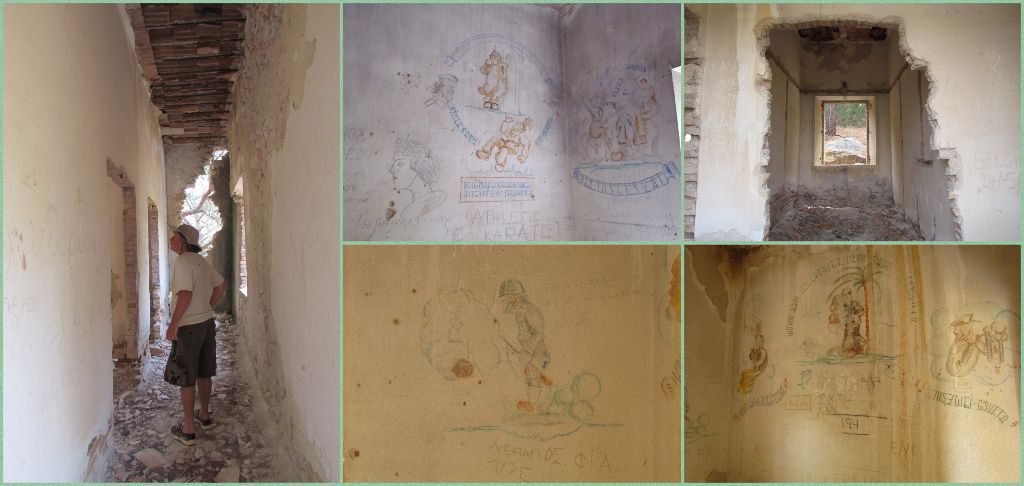 The next day after some morning cloud had fizzled away, we rowed ashore for an explore. Alimia is uninhabited but there are a few buildings ashore where German soldiers were stationed in WWII. Inside the falling down buildings can be seen cartoons and sketches done by the soldiers along with additions by more recent visitors.
