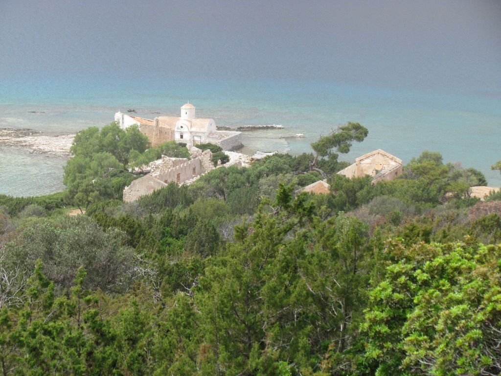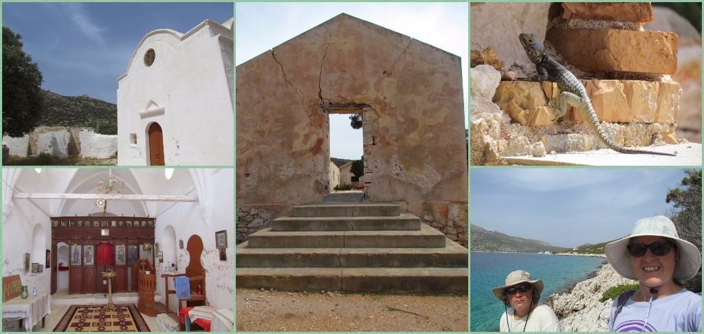 We followed a rough path that led us between juniper bushes and small pine trees. The island was very dry and the abundant flowers of Kasos were non-existent here. What plant life there was tried to attack us too. We received scratches from the bushes and after passing through clumps of waving, wheat like grasses we’d subsequently end up with sharp, spear like spikes stuck in our shoes and socks. There were no birds and the only goats we saw were two long dead ones in the buildings. The only animal life we saw was a Starred Agama lizard sunning itself and the evidence of plenty of spiders from the strands of webs joining the bushes we passed through (but thankfully no actual eight legged beasties).