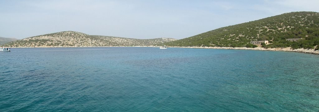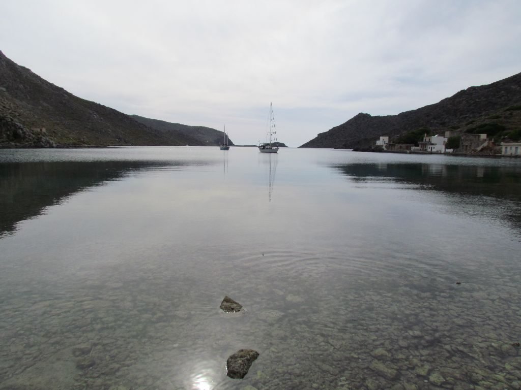 With decent winds forecast to blow us across the Karpathos Channel on Sunday, we needed to first make the jump up to Tristomo. The sea had barely a ripple in the light westerly winds and it was an uneventful motor up to the long, almost land locked inlet at the top of Karpathos. There is at least 8m of water in the narrow, southern entrance and as we turned in, the water became a beautiful cobalt blue.