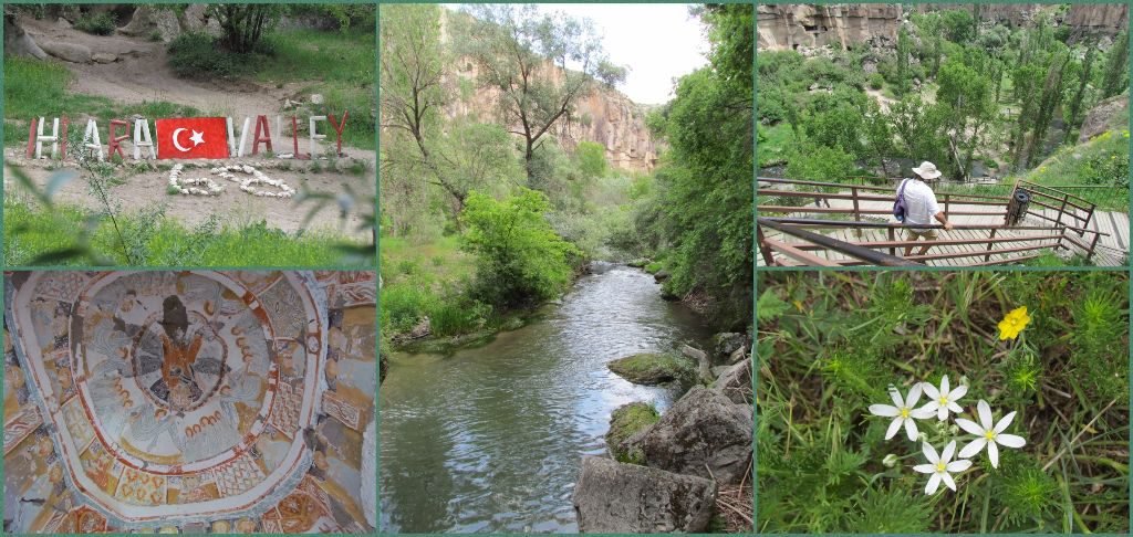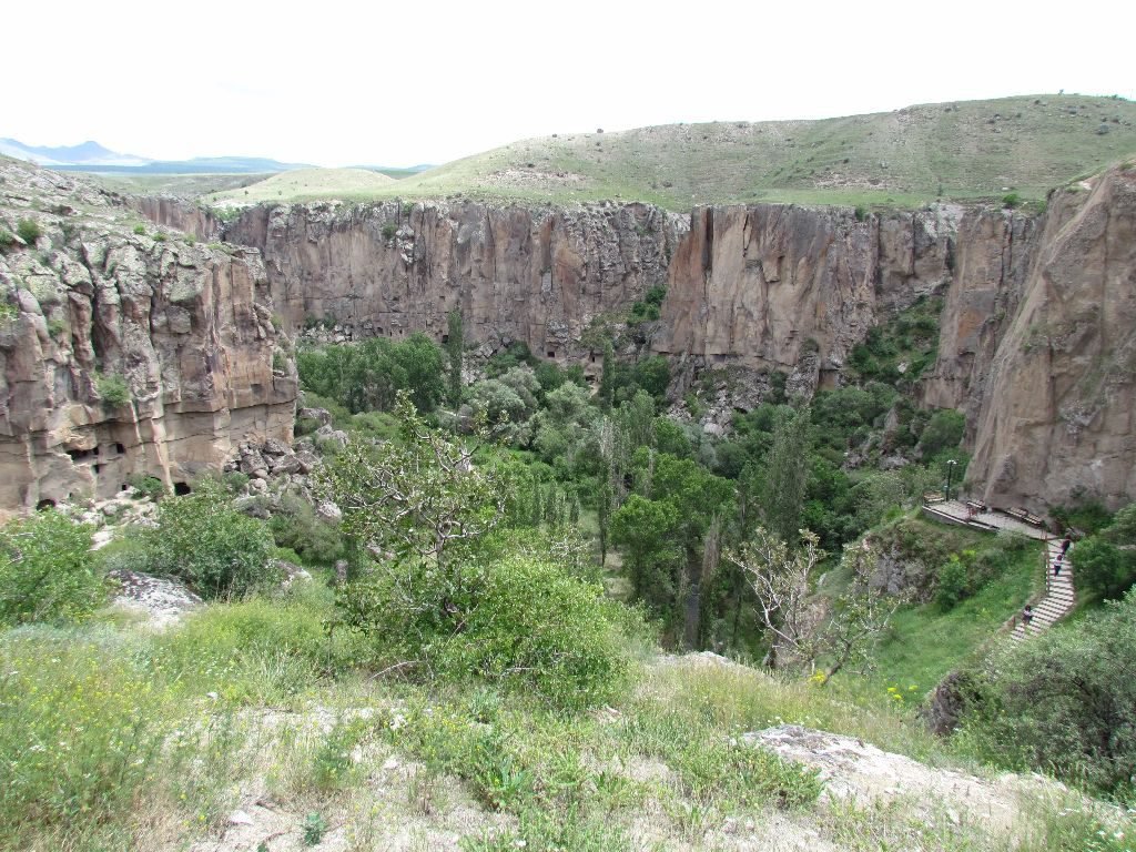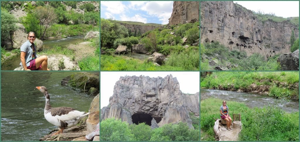 In previous times, Christian people lived in caves cut out of the steep canyon walls. There are a couple of churches with frescoes decorating the ceilings, but most of the paintings have been damaged. In the bottom of the valley a river runs; the name of the canyon means ‘warm water’ as the source is within a close by, dormant volcano. Due to the presence of the river, the canyon is very verdant. Trees provided shade and wildflowers were still in bloom.