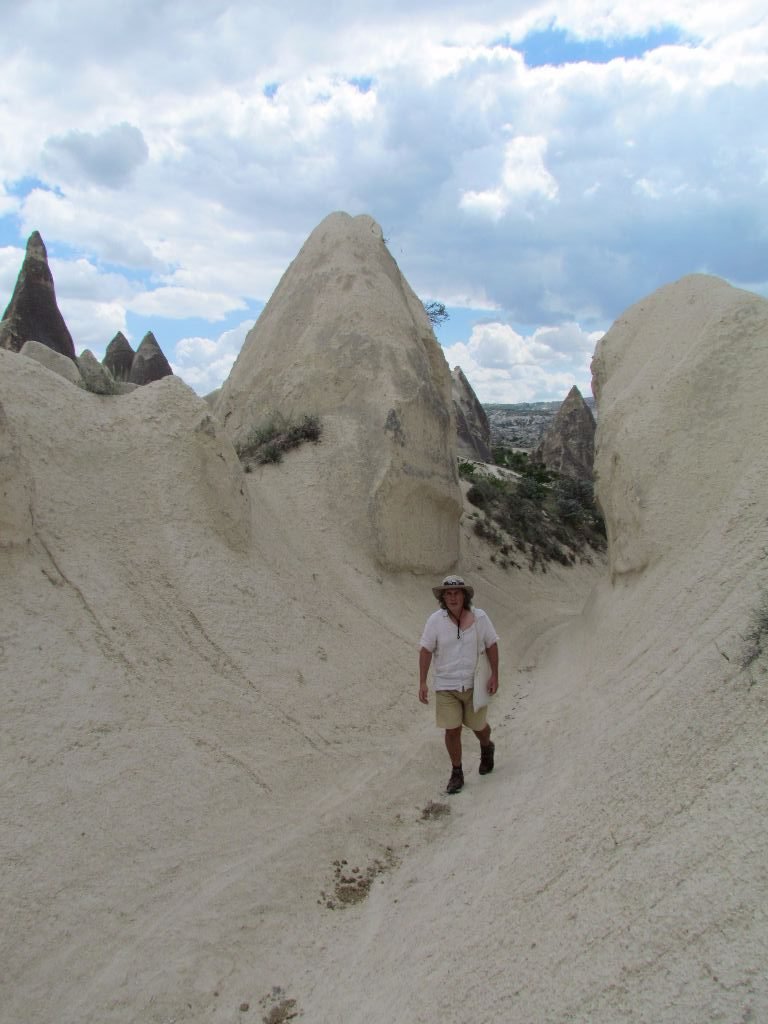 We headed out to walk towards the Red and Rose Valleys, recommended as the best walking area. The path led us through narrow gaps between chimneys. At times we followed the narrow channels made by water flow, walking up and down steep slopes where the surface was unexpectedly grippy. Initially, the rocks were coloured in shades of cream, we then came to an area of bright white. Here, instead of chimneys, the rocks had been eroded into twisting curls and swirls like the path a snake leaves in sand. We emerged onto the edge of a steep cliff side. Here we had an awesome view of the pale rose and darker red shades on the opposite side. It’s pretty obvious where those valleys get their names!