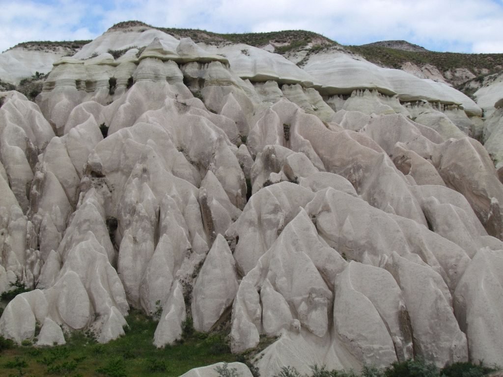 The fairy chimneys were everywhere, eroded by the weather into bizarre cone and pyramid shapes. The chimneys are all that remain of volcanic activity millions of years ago. Hard lava was laid over softer ash and over time the rocks have weathered at different rates. The landscape has been left with these shapes where a hard cap sits atop the compressed ash cone underneath. We saw chimneys in all states of development. From the elderly that had lost their cap and were wearing away to nothing, to baby chimneys being ever so slowly formed as wind and water did their work.