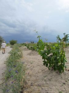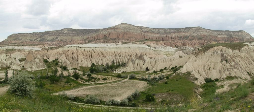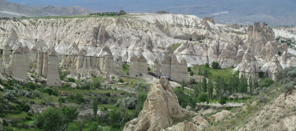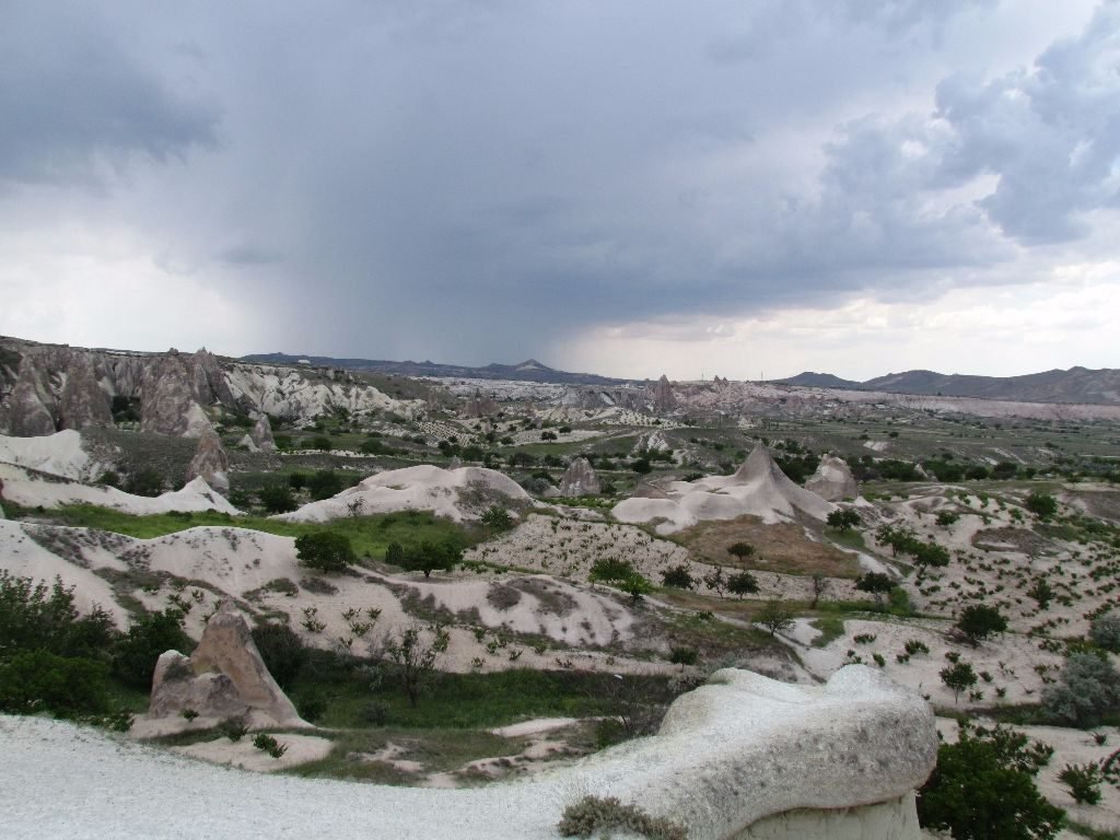 Back in Göreme we sat out the downpour drinking çay in a cafe and browsing a map looking for other ways to see Love Valley. It looked like a road ran out the top of the town that should give us a view looking down into it. Blue skies had returned so off we went, finding the side road on a section of the steep main road coming into Göreme It was more of a track in places and with more dark clouds gathering on the horizon, we hurried off down it to try and find a good viewpoint. Every time we turned a corner we’d hope for the view, every time dashed by fields of vines. Finally, we got what we were looking for and had a fine view of the phallic chimneys that give the valley its name.