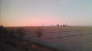 We had a few hours of travelling before darkness fell. I spent the time enjoying the spectacular scenery whizzing by, ranging from high mountain passes to flat, fertile plains. Once dark I managed a little bit of sleep, contorting myself into half comfortable positions but mostly doing an impression of a nodding (and dribbling) dog. I highly recommend an eye mask and earplugs. At dawn, I awoke to find us travelling along a so-straight-it-could-have-been-built-by-Romans road. The landscape was flat as a pancake with fields and agricultural buildings as far as the eye could see. As we motored on eastwards, a dark pimple became faintly visible through the rosy haze. It darkened as we got closer into a snow-streaked dormant volcano.
