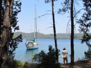 Our nights at anchor included being tied back to a tree, not our favourite method of mooring but the only sensible way in some of the Turkish places we visited.