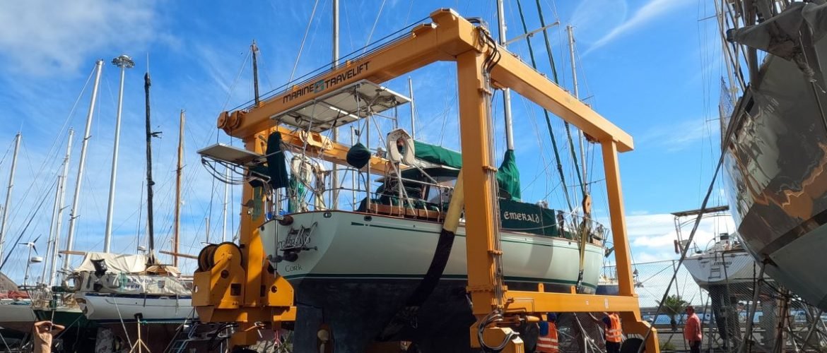 Emerald has spent the last 15 months parked in front of the shed where the boat crane is kept. We’d become very familiar with the beeping sound that it makes every time it moves and named it Bertrand le Beep. We’d enviously watched other boats leave, but at last Bertrand was coming for us.