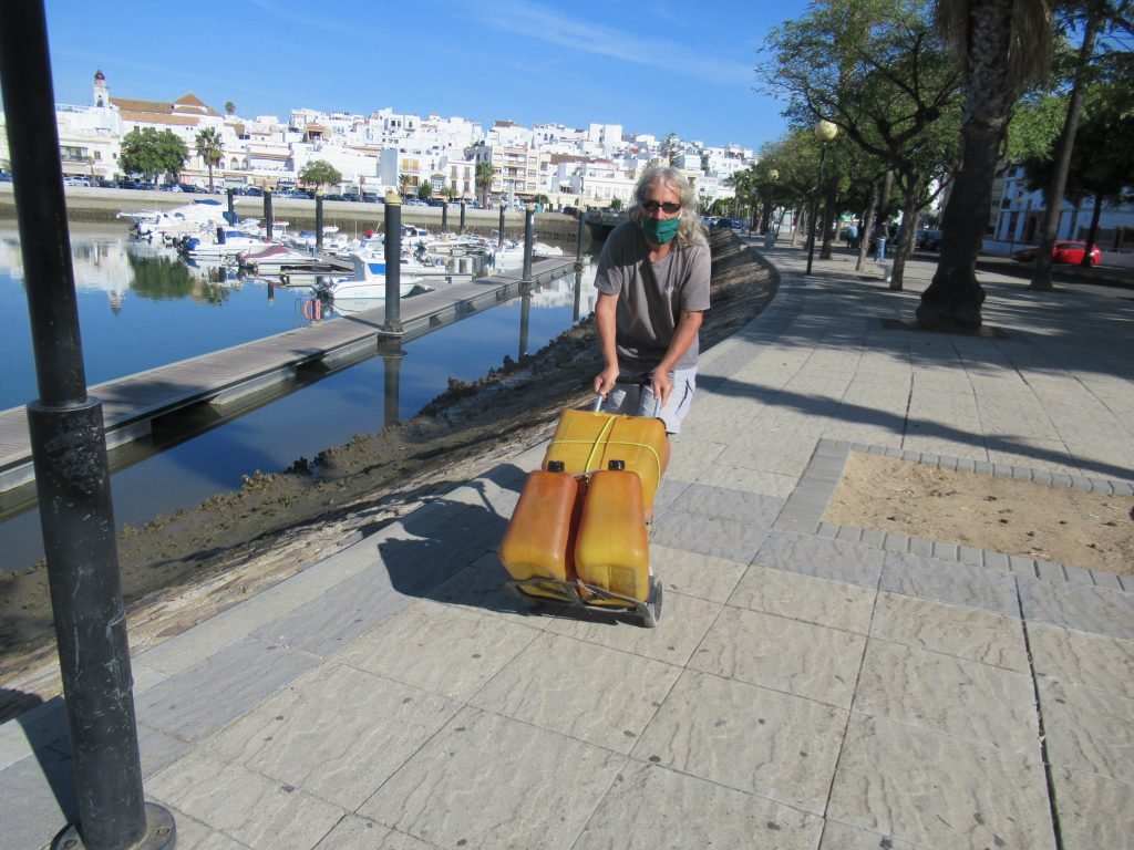 However, even with the precious cargo safely stored, we couldn’t rest. By the time we left the marina, 24 hours later, Emerald had had a good clean, inside and out, as had us and our clothes. She was sitting slightly lower in the water, a result of topping up the diesel cans and restocking the food and beer supplies. The marina does not have a fuel station, so we took several trips to the nearest road-side station with trolley and cans.