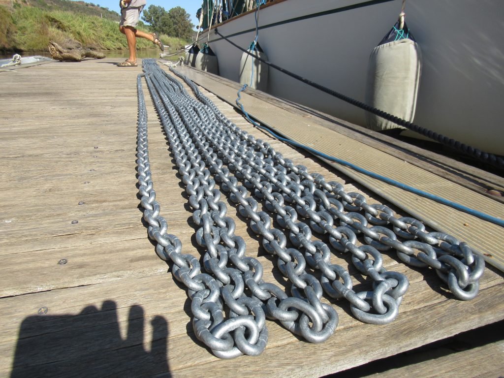 The advantage of having a rust-free stainless chain that coils easily in the anchor locker was tempting, but with our budget we could not justify the additional cost of stainless. We chose to concentrate on sourcing good quality galvanised chain instead.