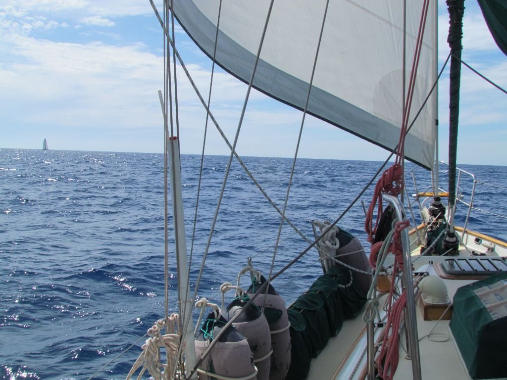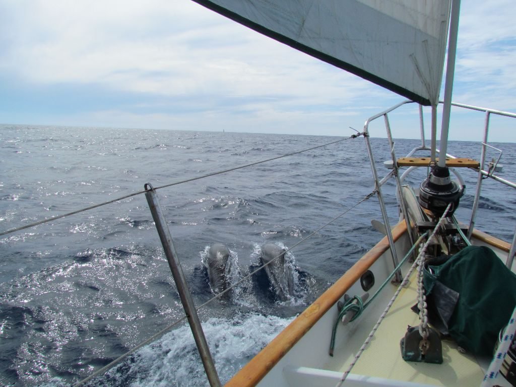 We went for a slightly more north course to keep the wind at a better angle for us to sail, nudging west as the wind varied. Dolphins came to visit us on and off, one group playing for over an hour around Emerald’s bow, leaping out of the water and looking like they were having a grand old time. After last season’s dolphin drought, it was wonderful to have them back. There’s something incredibly special about looking down from the bow and making eye to eye contact with a dolphin looking back at you.